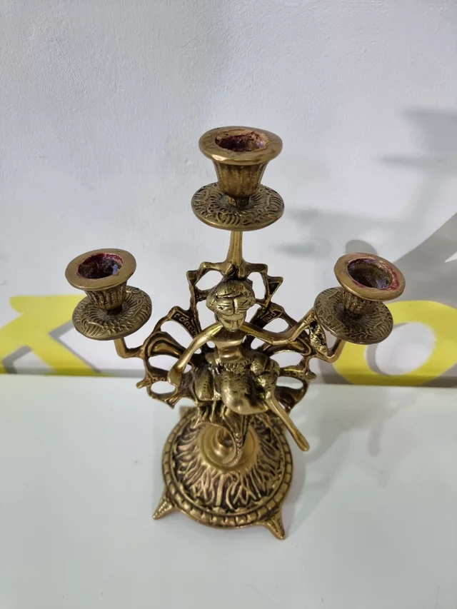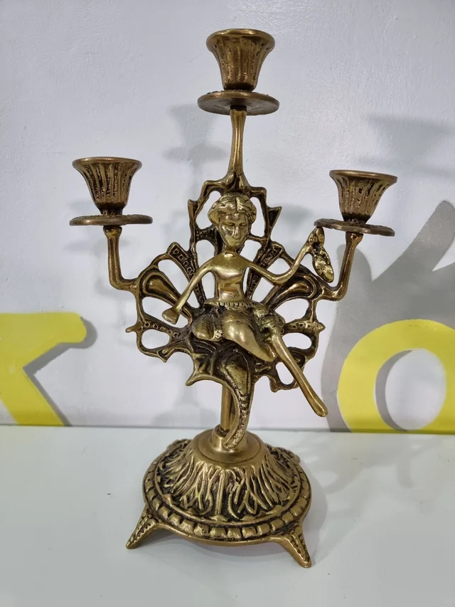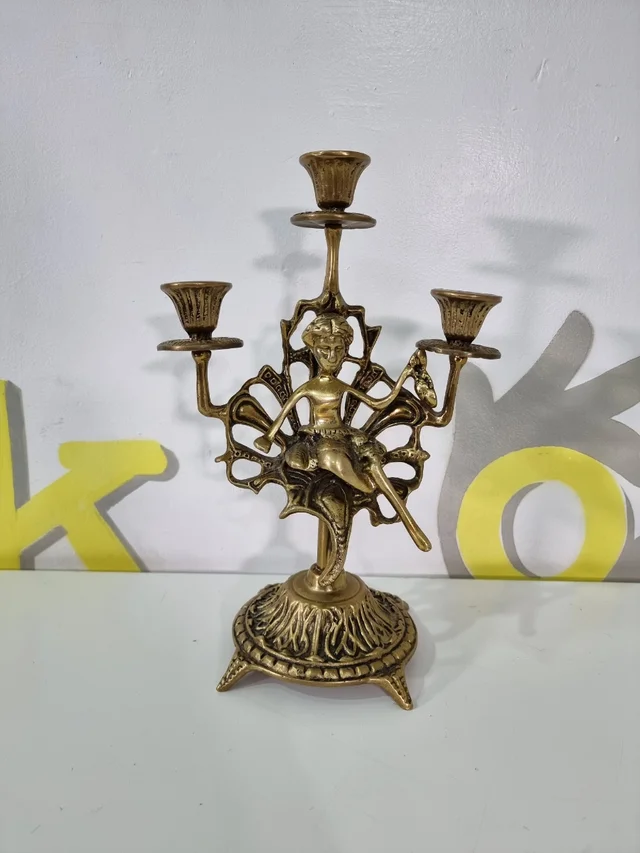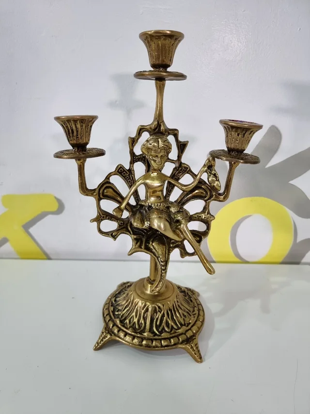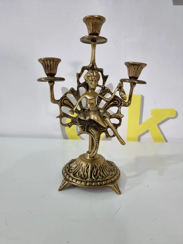 candelabro dorado de bronce con figura de mujer medidas 29 alto X 20 ancho